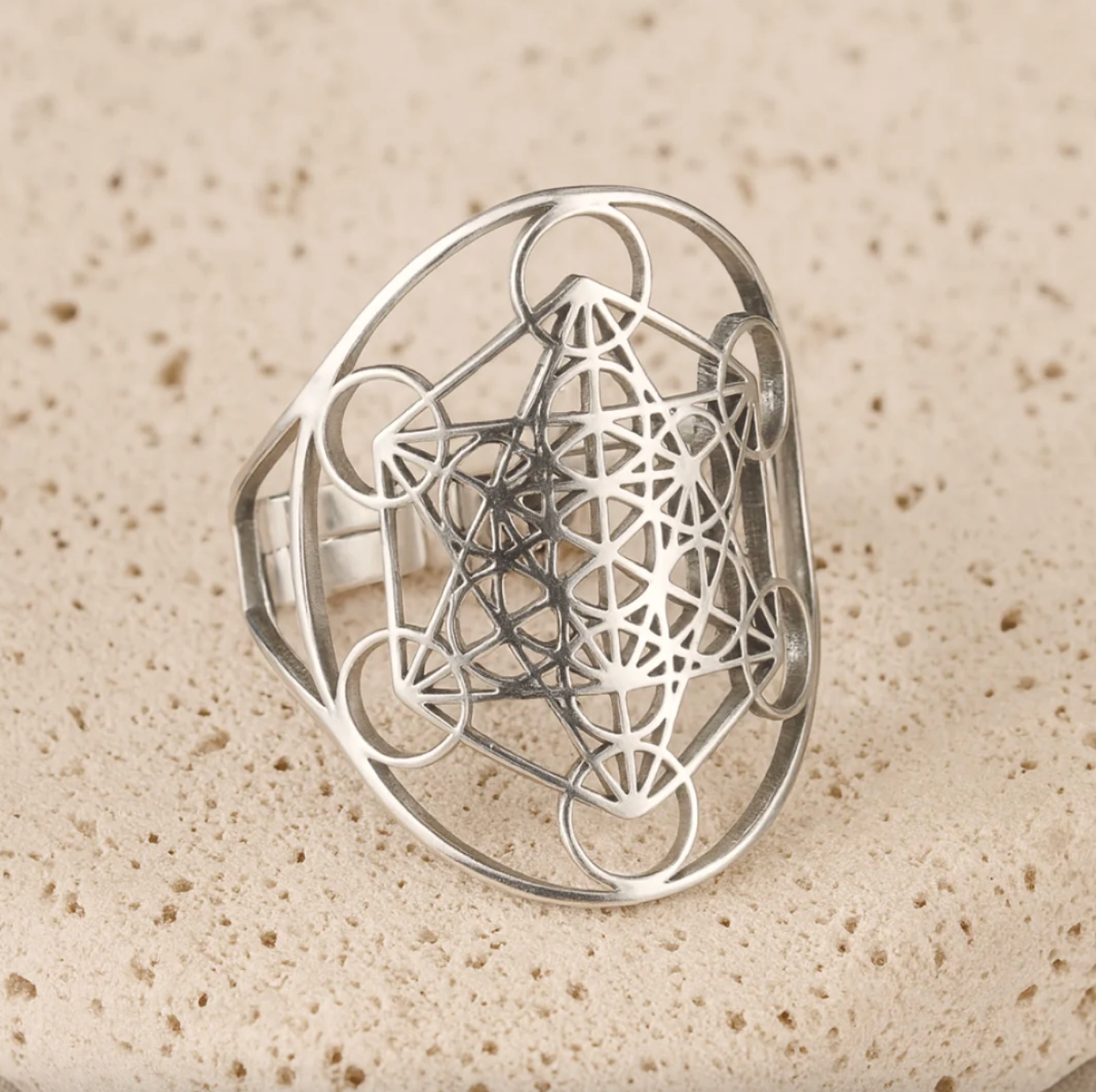 Das Metatron-Würfel-Symbol auf dem Ring ist eines der heiligsten geometrischen Muster überhaupt. Es repräsentiert die Struktur des Universums, die Verbindung zwischen Materie und Geist sowie die Balance aller Elemente.