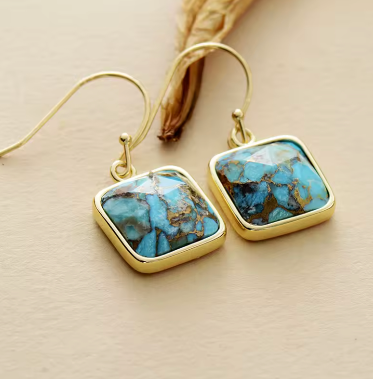 Erlebe die erfrischende Energie des Türkis – ein Edelstein, der für Schutz, Ausgleich und innere Stärke steht. Seine lebendige, himmelblaue Farbe und natürliche Maserung machen jedes Paar Ohrringe zu einem einzigartigen Symbol für Harmonie und Klarheit.