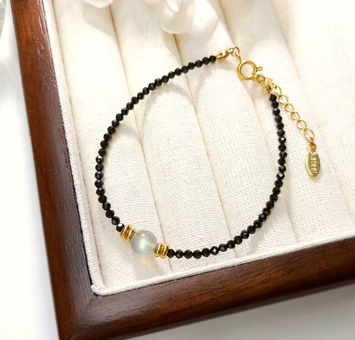 Dieses exquisite Armband aus tiefschwarzen Spinell-Perlen und einer schimmernden Labradorit-Perle im Zentrum ist mehr als nur ein stilvolles Schmuckstück – es vereint Eleganz, Energie und symbolische Kraft.