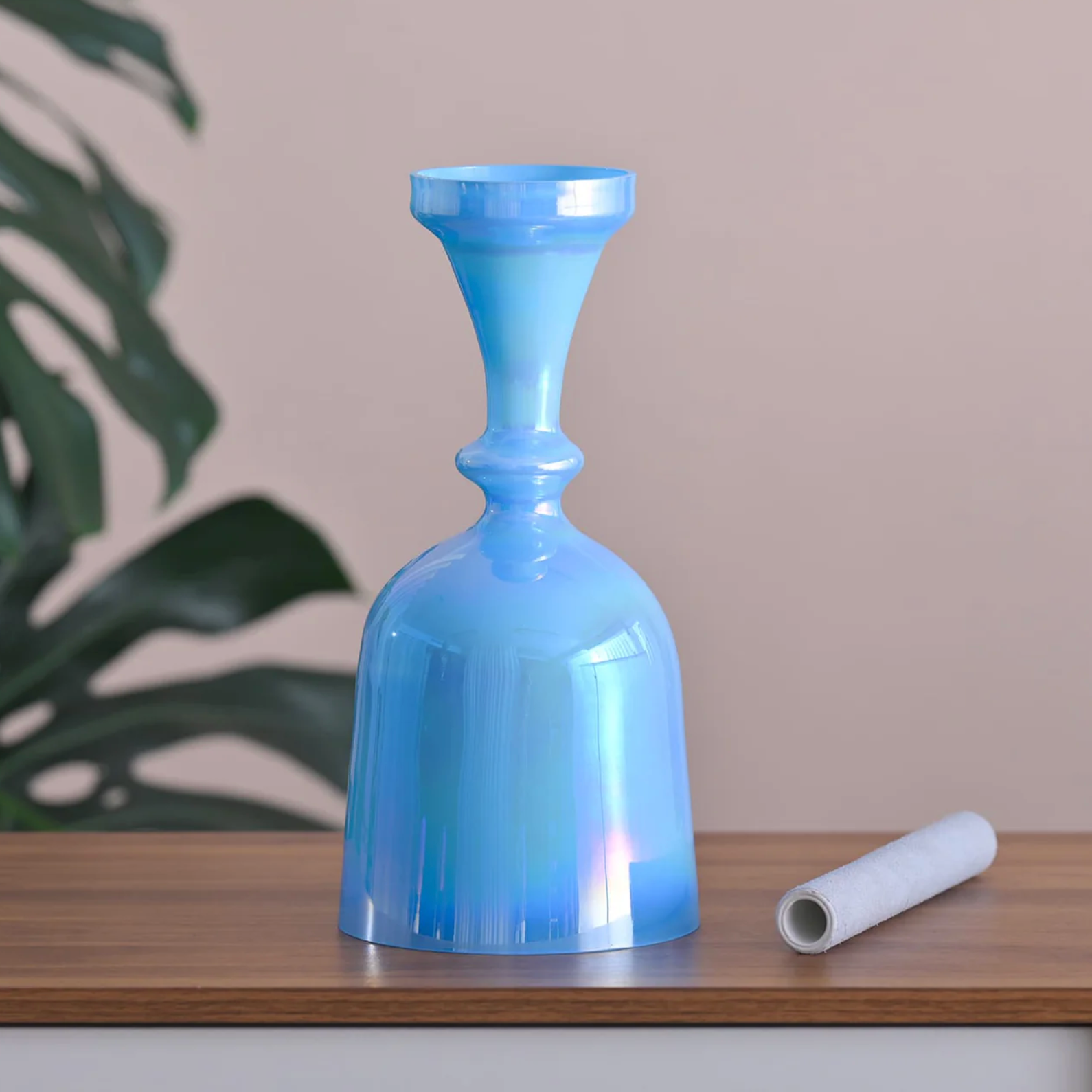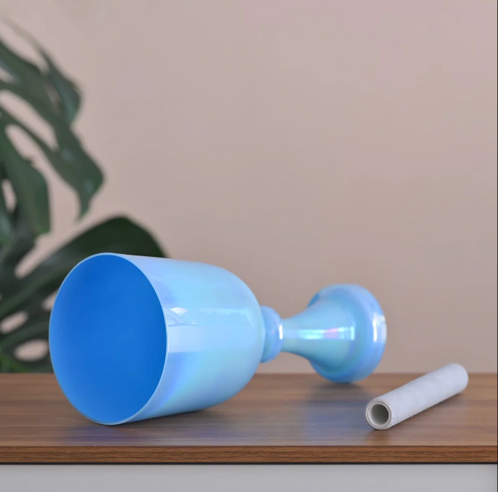 Die blaue Kristallklangschale mit Stiel aus Quarz vereint zeitlose Eleganz mit einer beruhigenden, klaren Ausstrahlung. Ihr sanft schimmerndes Himmel- bis Aquablau reflektiert das Licht dezent und schafft eine Atmosphäre von Weite, Stille und innerer Klarheit.