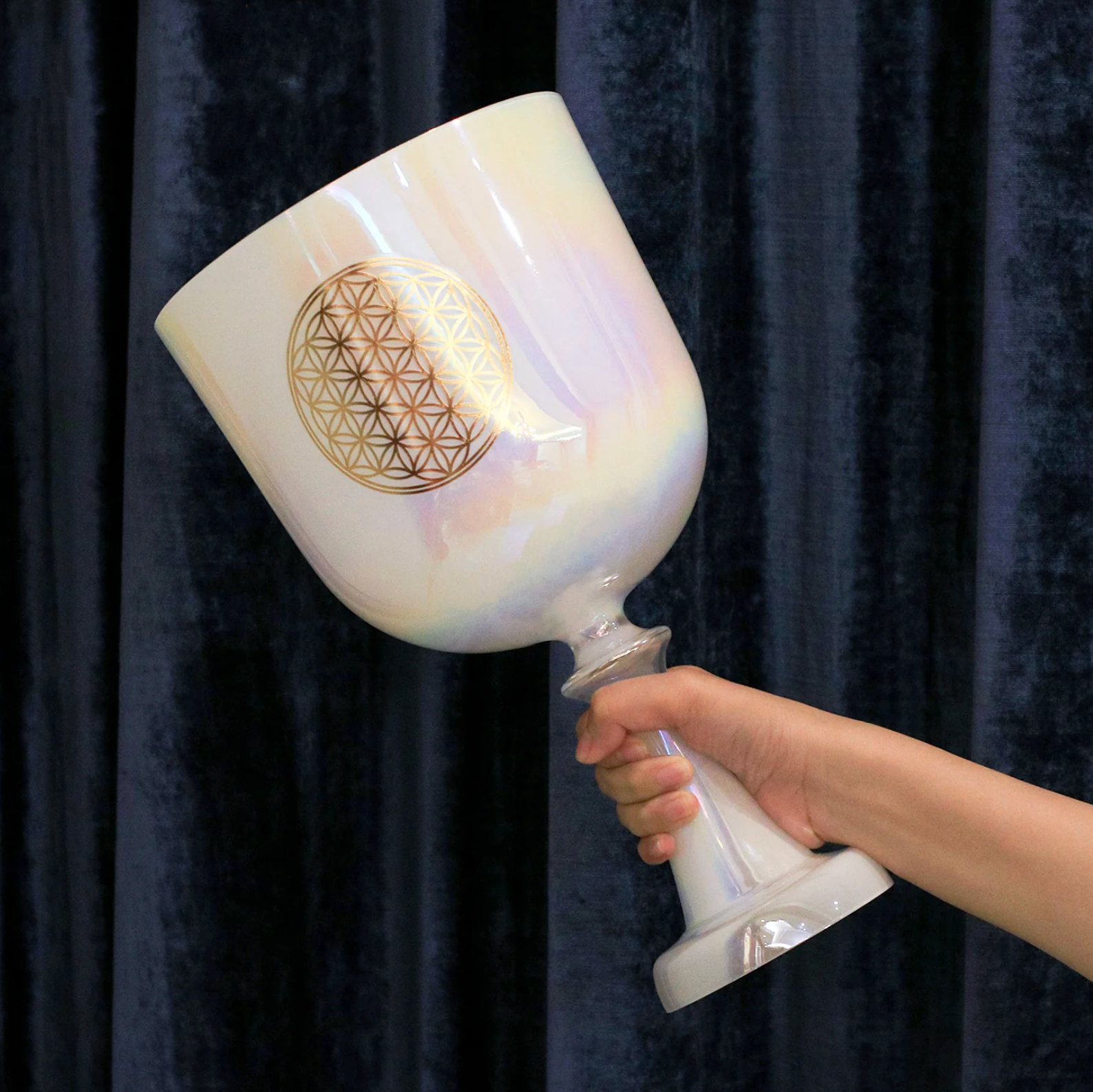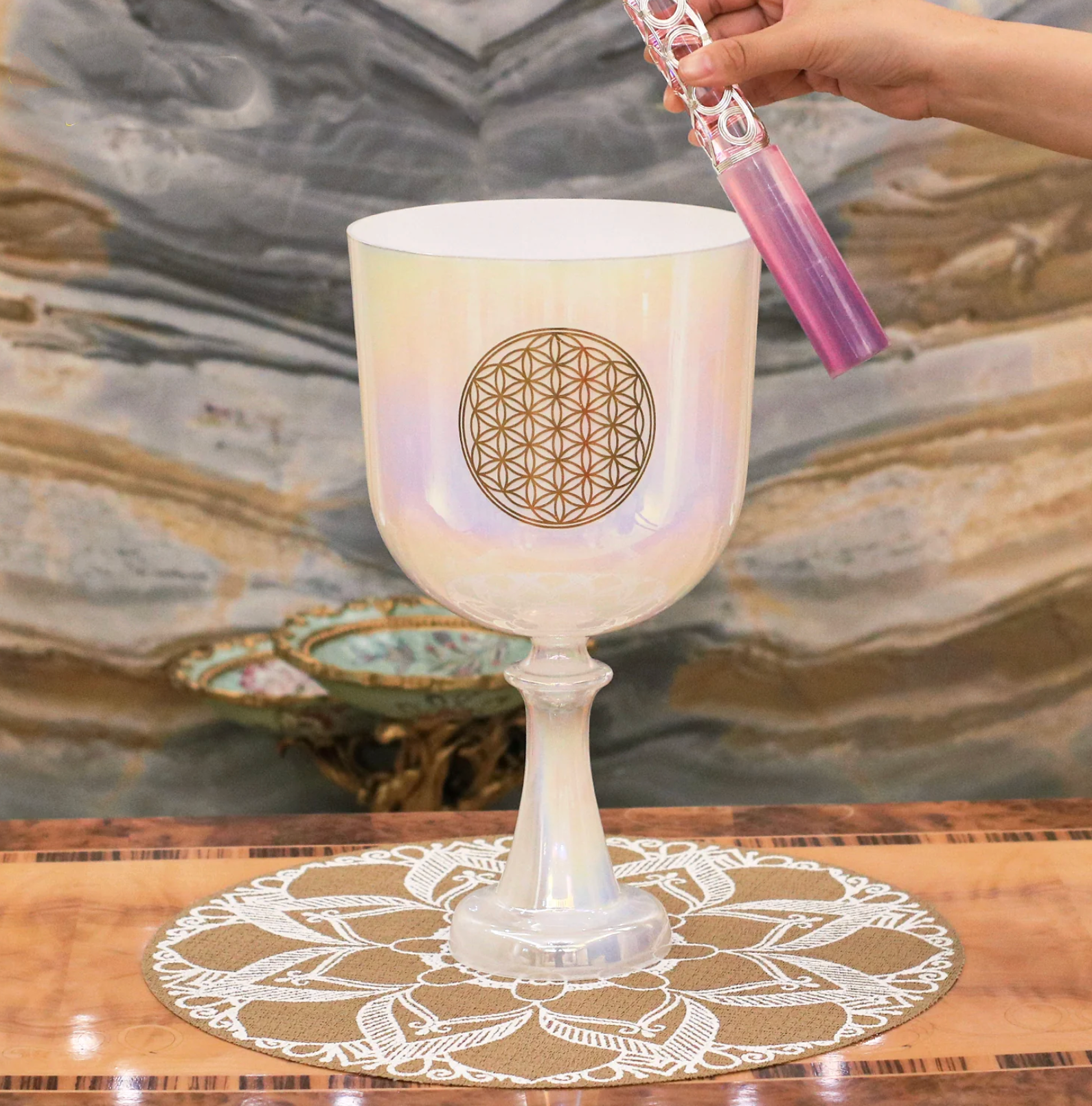 Entdecke den bezaubernden Charme unserer Kristallklangschale mit Stiel „Blume des Lebens“.