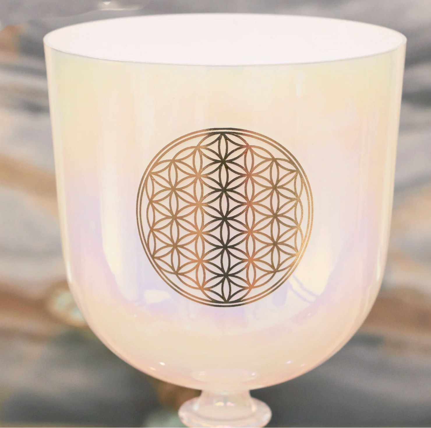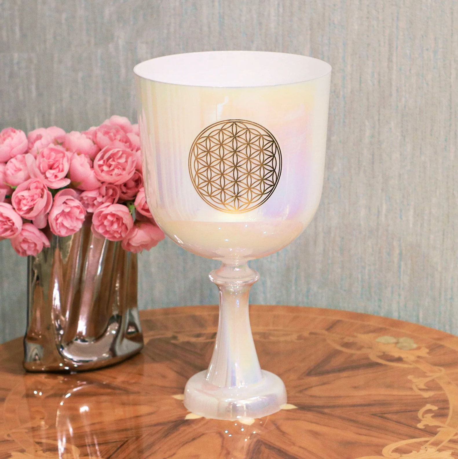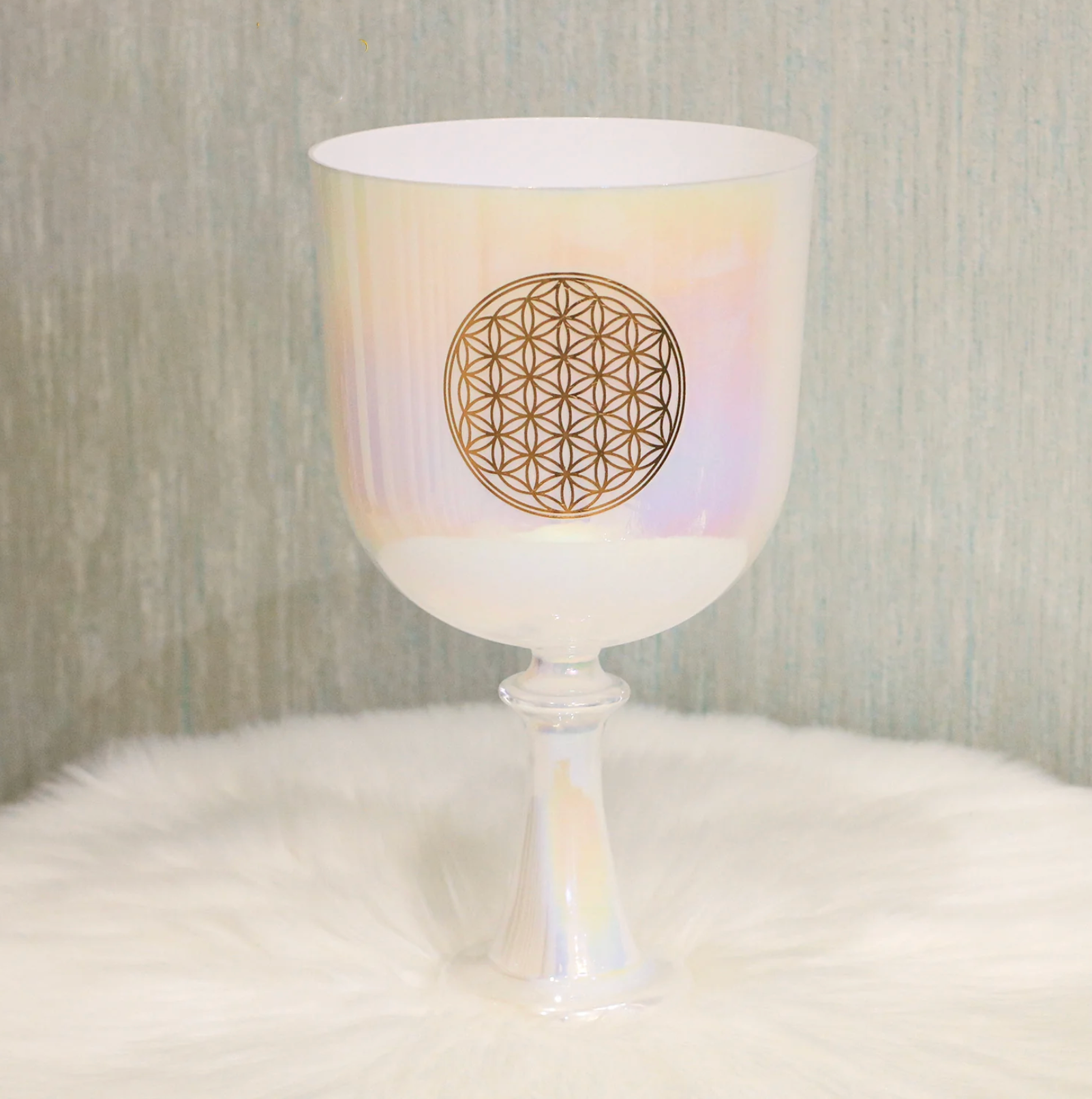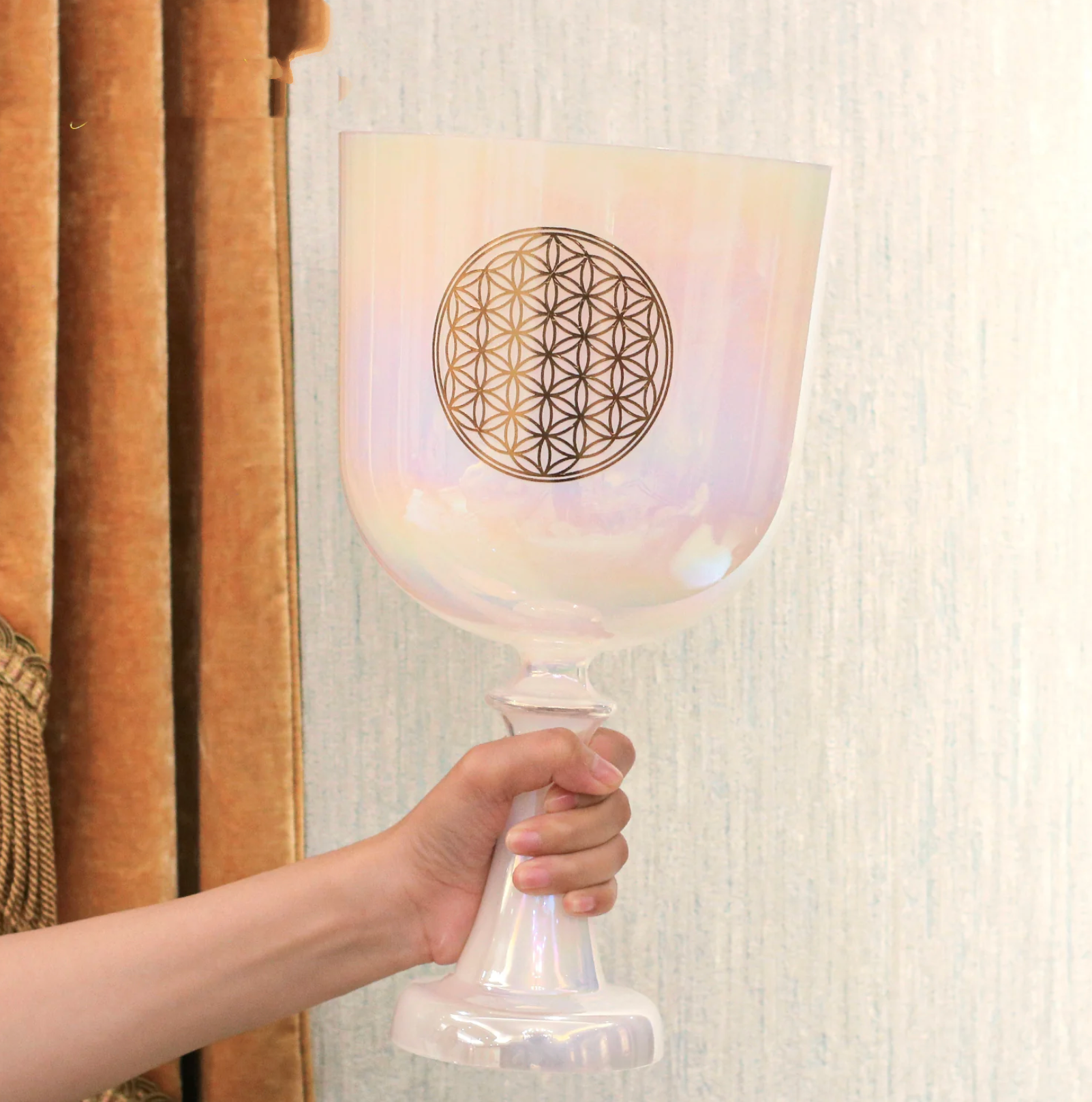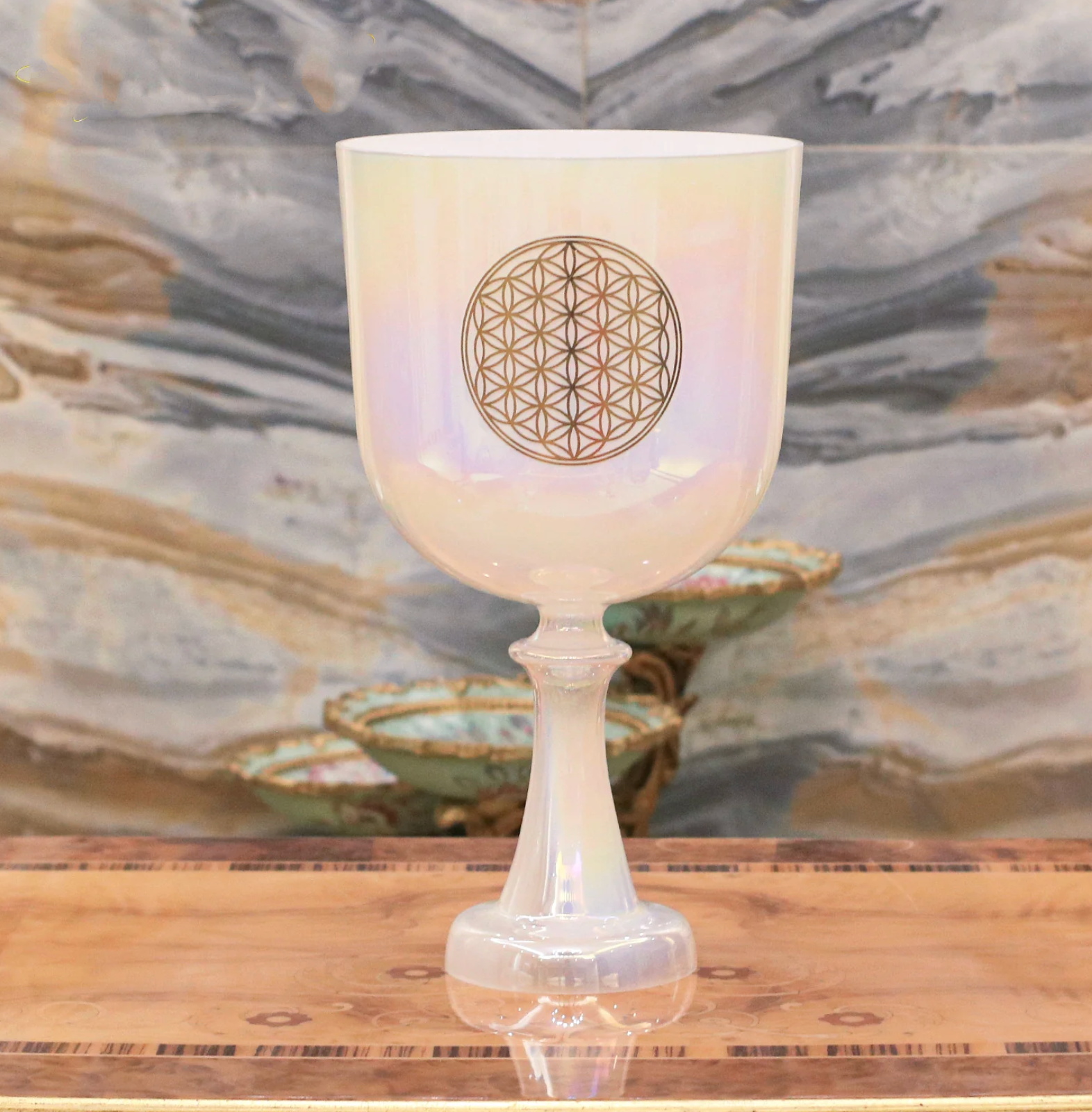 Kristallklangschale mit Stiel aus Quarz „Blume des Lebens“