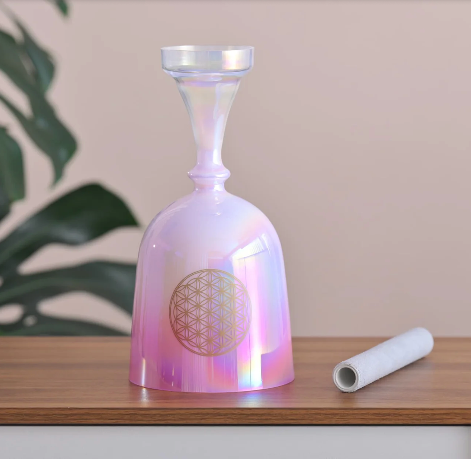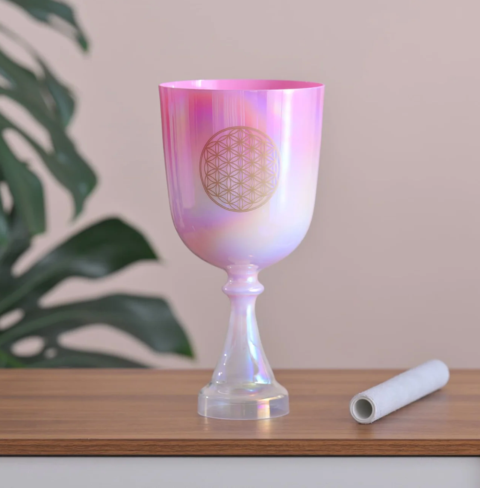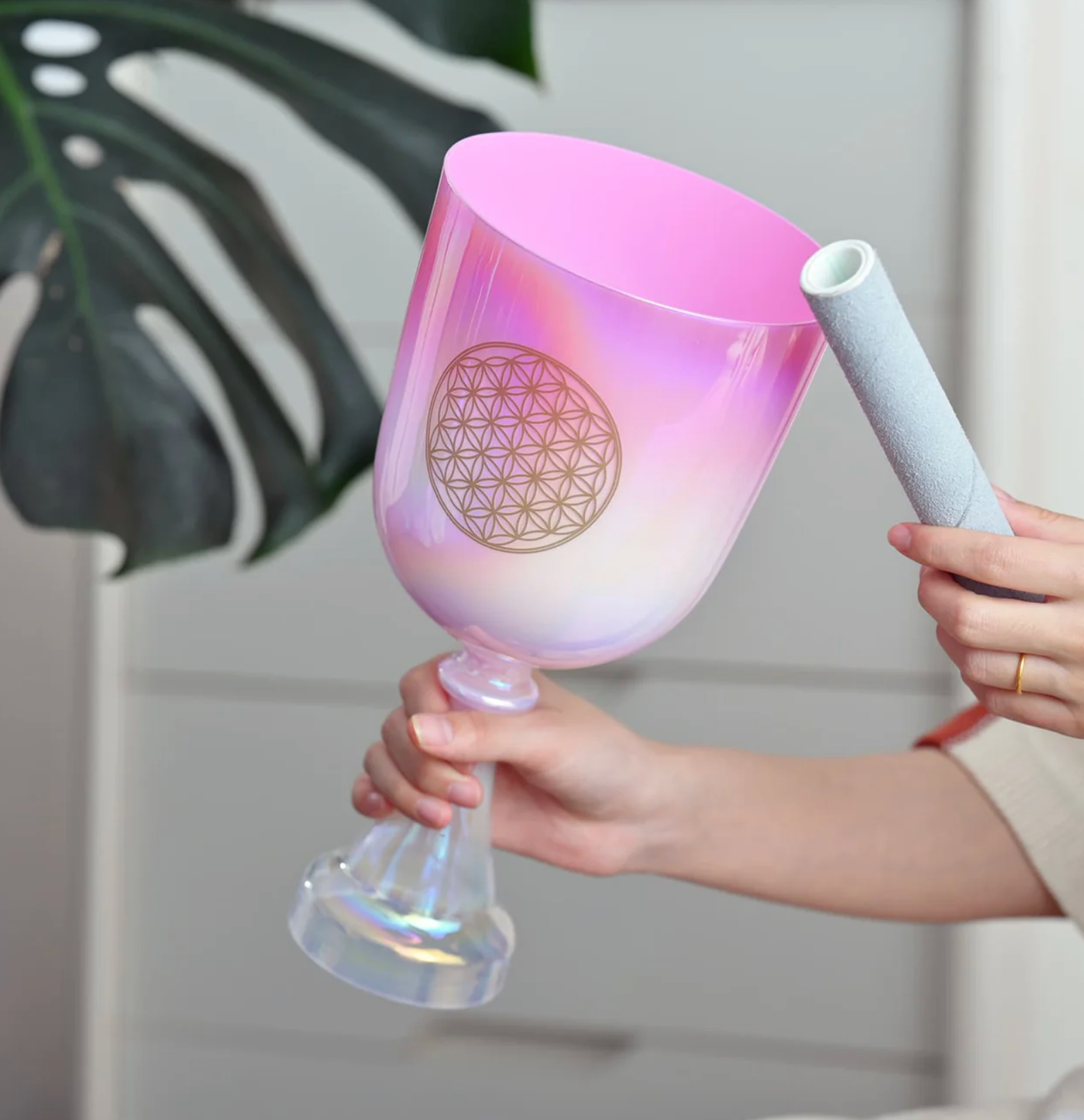 Entdecke die besondere Ausstrahlung unserer Kristallklangschale mit Stiel aus Quarz „Blume des Lebens“. Mit ihrem zarten perlmutt-roséfarbenen Schimmer und dem sanften irisierenden Farbverlauf verbindet sie ästhetische Eleganz mit tiefgehender Klangwirkung.