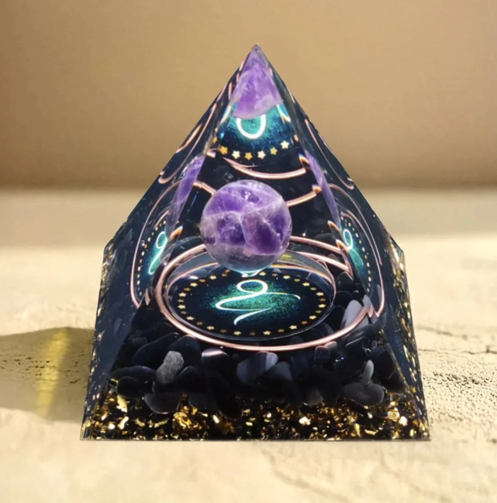 Unsere Sternzeichen Orgonit-Pyramide aus Obsidian, Amethyst, Kupfer und hochwertigem Harz vereint kraftvolle natürliche Materialien zu einem einzigartigen energetischen Objekt, dem eine schützende, beruhigende und harmonisierende Wirkung nachgesagt wird. Sie verbindet Ästhetik mit einer symbolischen, tiefgehenden Unterstützung für dein emotionales Wohlbefinden.