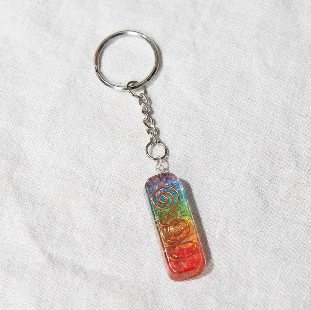 Questo colorato portachiavi dei chakra unisce la forza simbolica dei sette chakra con la spirale purificatrice in rame: un accessorio elegante e un promemoria quotidiano del tuo equilibrio interiore.